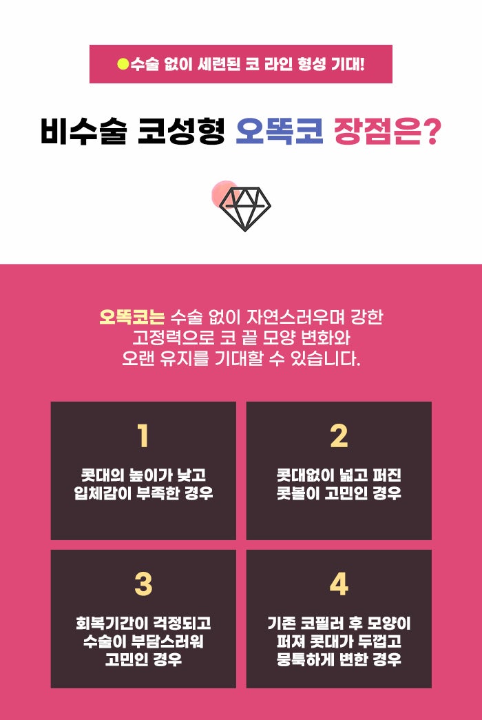 코조각주사의 경우에는 넓고 뚱뚱해 보이는 콧볼 변화를 기대할 수도 있다고 알려져 있는데요. 콧대의 높이, 코 높이에 대한 고민이 있는 경우 다른 방법이 적합한 선택이 될 수도 있다고 합니다. 오똑코는 실을 이용하는 방식인데요. 콧대, 코끝까지 전체적인 라인의 변화를 기대할 수도 있다고 알려져 있습니다.