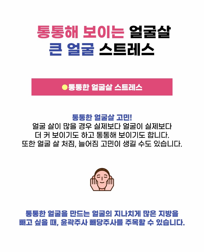 그런데 다이어트를 하는 것도 어렵고, 살을 빼더라도 원하는 부위 살이 잘 빠지란 보장은 없습니다. 체중을 줄일 경우 살이 전체적으로 빠지고 얼굴 살도 빠질 수 있지만, 옆 볼 등 원치 않는 부위 살이 더 많이 빠지고, 늘어진 턱살은 더 눈에 띌 수도 있는데요. 또 턱살, 이중턱으로 인해 고민하는 모든 분이 통통한 체형을 가진 것은 아닙니다.