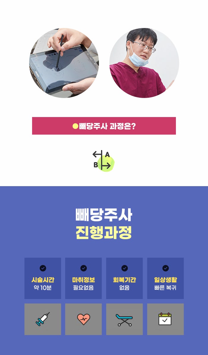 빼당주사의 경우 괸리 시 마취가 필요하지 않을 정도로 피부 부담, 통증 부담이 적은 편에 속한다고 알려져 있습니다. 당연히 마취에 대한 걱정도 줄어들고 반복 관리 시의 통증, 회복 기간에 대한 걱정도 줄일 수 있는 편입니다. 빼당주사 반복 관리의 경우 3-5회 정도 진행하는 편이라고 하는데요. 관리 간격의 경우 2주에서 1달 가량이라고 합니다.