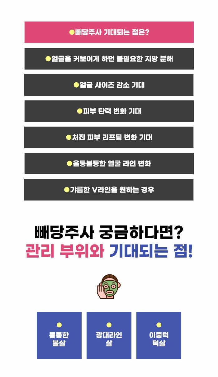 처음부터 해당 성분이 들어있지 않은 관리를 결정한다면 이런 망설임도 필요하지 않을 것 같습니다. 빼당주사는 스테로이드, 히알루로니다제를 이용하지 않다 보니 이런 불안을 줄일 수 있습니다. 또한 이중턱, 턱살 부위에만 관리를 적용하는 게 아니라 광대 라인 부분, 볼살, 심부볼 등 여러 부위의 얼굴 살 고민에 적용할 수도 있다고 합니다.