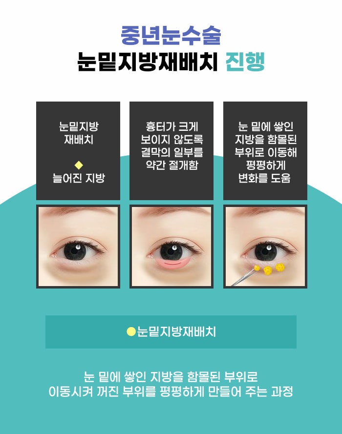 눈 밑에 지방이 쌓여 돌출되었을 때 흉터가 겉으로 크게 눈에 띄는 방법이 아닌 방식으로 눈밑지방재배치를 진행하게 된다고 하는데요. 결막의 일부를 약간 절개한다고 하며, 국소마취나 수면마취를 통해 진행되는 편이라고 합니다. 함몰된 곳으로 지방을 이동시켜 채워주고 평평하게 해주는 과정은 약 30분에서 1시간 정도가 걸리는 편이라고 합니다.