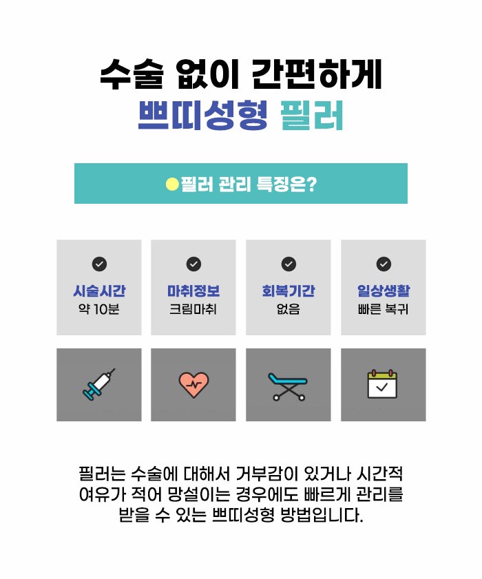 필러는 주사 관리이다 보니 빠르게 진행할 수 있다는 점이 장점인데요. 부위에 따라서 다르지만 국소마취나 마취크림을 이용해 간단하게 진행할 수도 있다고 합니다. 또한 긴 회복 시간을 가질 필요가 없다고 합니다. 또한 필러 관리 부위도 다양한데요, 코 라인을 바꾸기 위해서 코필러 관리를 찾기도 합니다. 그리고 입술을 더 도톰하게 하기 위해 입술필러를 찾기도 합니다.