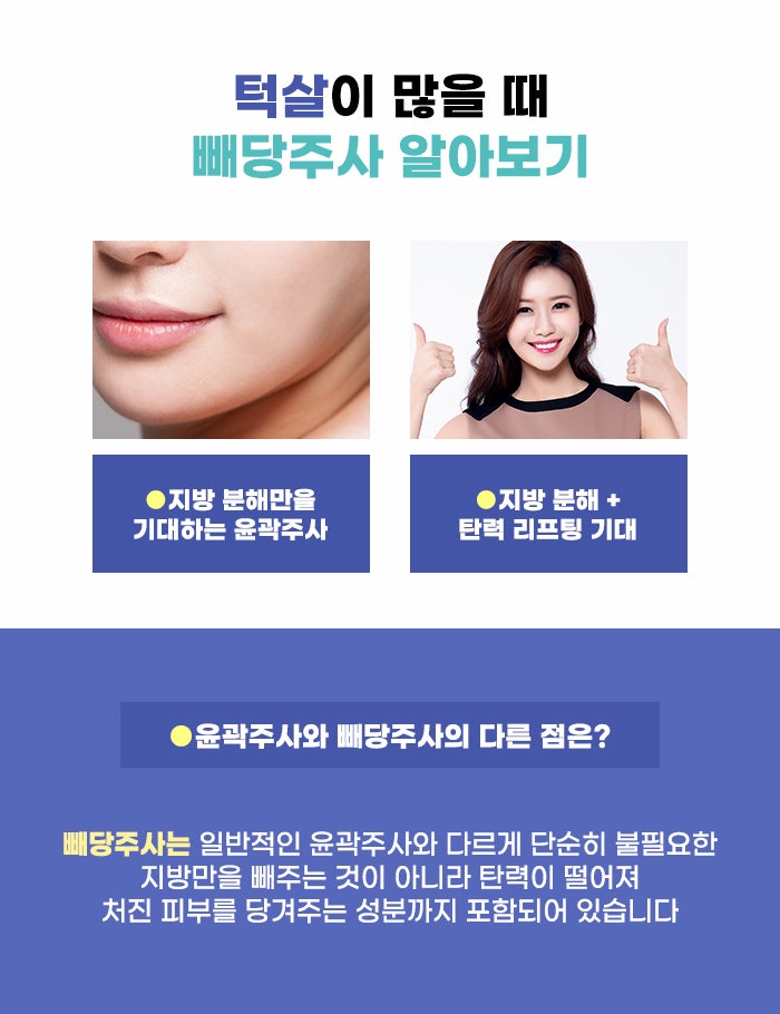 그런데 턱선에 지방이 지나치게 많거나, 턱선의 처짐이 있는 경우, 그리고 턱에 근육이 너무 많거나 침샘 비대증이 있는 경우 등에 속한다면, 무조건 무언가를 더하는 게 아니라, 뺄 수 있는 것을 빼는 선택도 중요할 수 있는데요. 빼당주사는 과도한 지방 분해를 기대할 수도 있는 주사 관리라고 합니다.