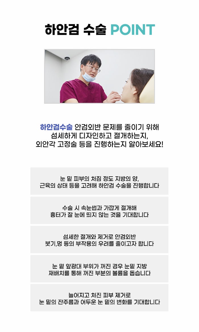 또한 하안검 수술을 필요로 하지 않는 경우도 있다고 합니다. 눈 밑에 지방이 튀어나오거나 패임이 생기면서 하안검 수술이 필요한지 고민하는 경우도 있습니다. 하지만 하안검 수술이 필요할지 고민되더라도 피부 처짐, 주름이 없는 상태이며 지방만 튀어나온 상태라면 피부 절개, 절제 방식이 아니라 지방을 제거하는 방법을 결정할 수도 있다고 합니다.