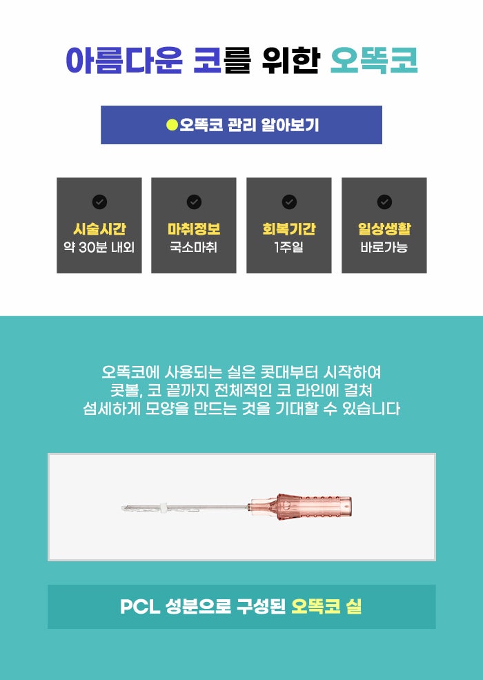 강한 고정력을 통해 코끝 모양을 변화시키고 오랜 유지를 기대할 수도 있다고 합니다. 이 오똑코 관리의 경우 국소마취를 하고 진행하는 편이며 회복 기간은 1주일 정도 갖는 편이라고 합니다. 또한 오똑코 관리에 걸리는 소요 시간은 약 30분 내외 정도라고 합니다. 회복 기간이 걱정되고 절개, 보형물을 이용하는 큰 수술이 부담이 되는 경우에 오똑코를 선택할 수도 있습니다.