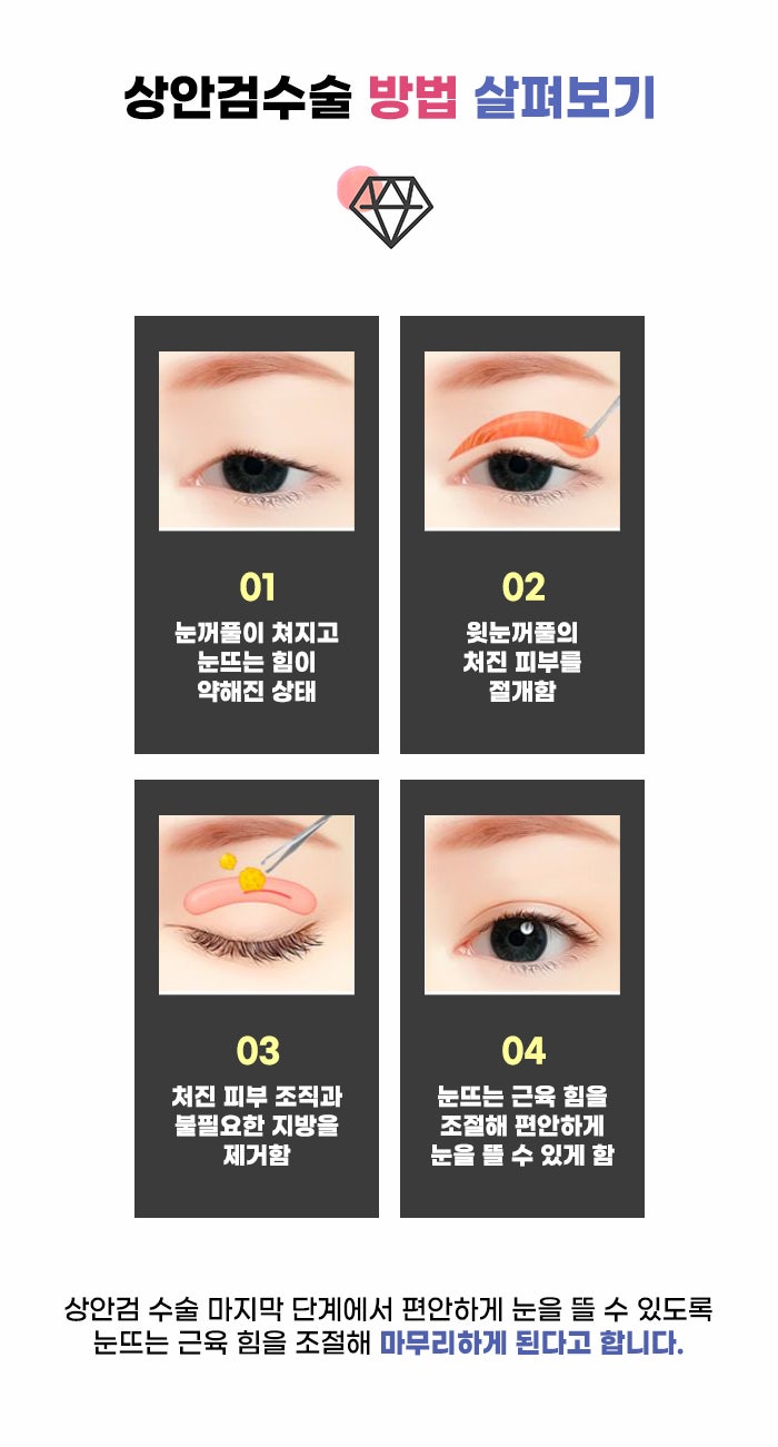 상안검 수술은 단기 수면마취를 하고 진행된다고 하는데요. 윗눈꺼풀의 처진 피부를 절개하고 처진 피부 조직을 제거합니다. 또한 필요한 경우 불필요한 지방을 제거하기도 합니다. 이 과정은 1시간 정도가 걸리는 편이라고 하며, 눈 뜨는 근육의 힘을 조절해 마무리하게 된다고 합니다. 보통 부기는 약 1-2주, 일상생활 복귀는 1-2주 후라고 하는데요. 개인별로 과정, 시간, 결과와 부기 등은 다를 수 있겠습니다.