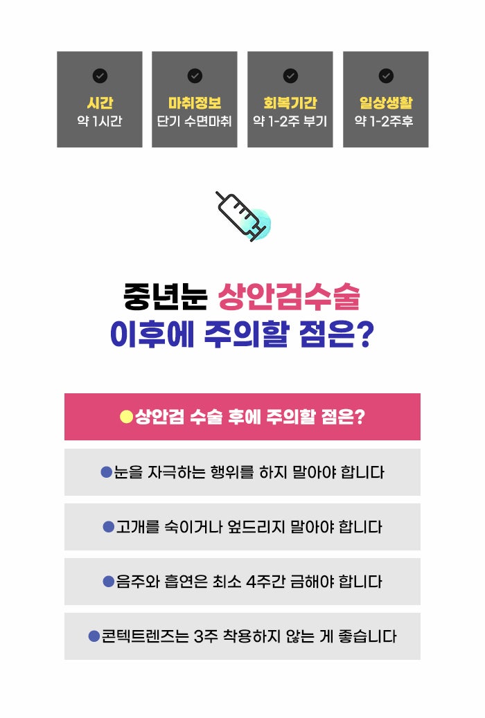 또한 음주, 흡연을 하지 말아야 하는데요, 최소 4주는 금해야 한다고 합니다. 시력이 좋지 않은 분은 렌즈나 안경을 사용할 텐데요, 콘텍트 렌즈의 경우 3주간 착용하지 않는 게 좋다고 합니다. 눈에 자극을 주는 행동은 하지 않아야 하는데요. 눈꺼풀을 세게 비비거나 눈물을 많이 흘리며 우는 것, 고개를 숙이거나 엎드리고 자는 행동은 자제해야 하겠습니다.