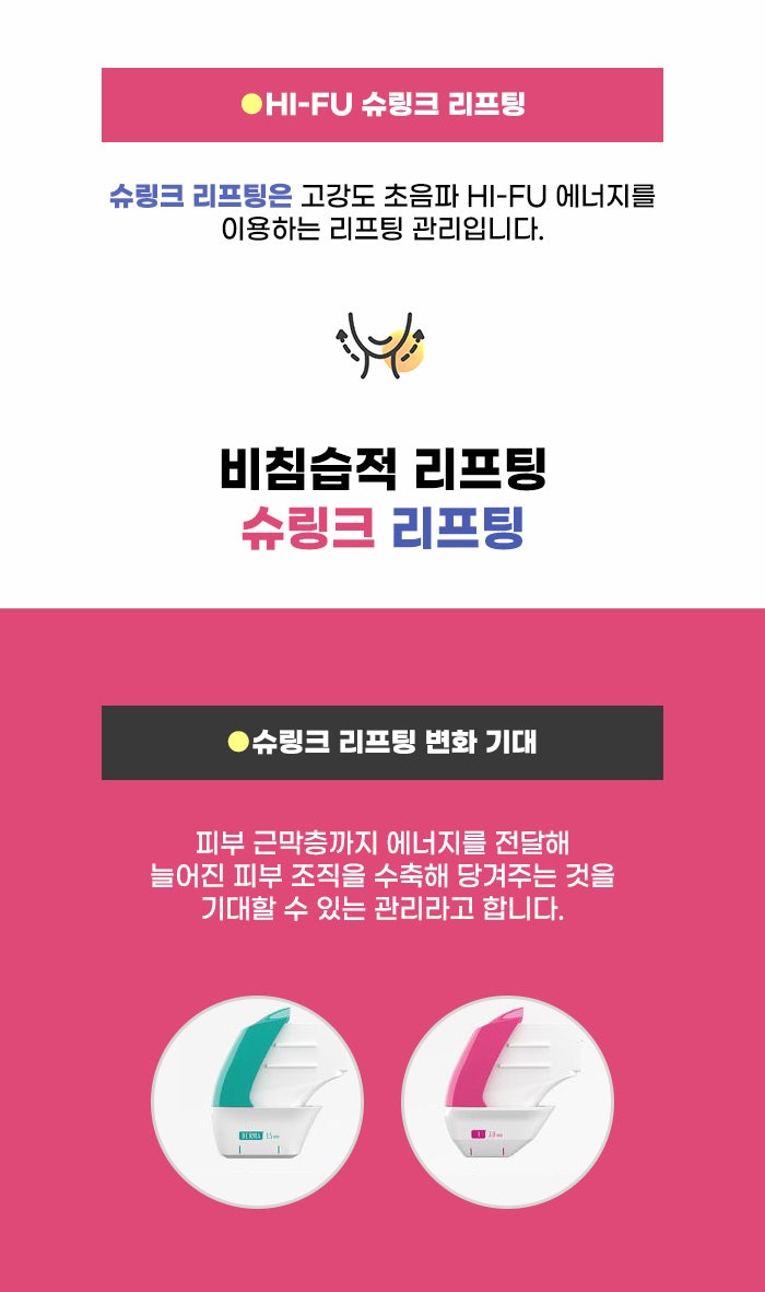 슈링크는 고강도 초음파 에너지를 사용해 늘어진 피부를 당기는 변화를 기대할 수 있다고 합니다. 볼뉴머의 경우 고주파 에너지를 전달해 피부 속 줄어든 콜라겐 재생 유도를 기대할 수도 있다고 합니다. 현재 얼굴선 처짐, 지방의 늘어짐 때문에 스트레스를 받는 경우 시너지를 낼 수 있는 다른 관리에 대해서도 궁금할 수 있을 것 같은데요. 다양한 리프팅 관리에 대해서도 알아볼 수 있다고 하니 참고하셨으면 좋겠습니다.