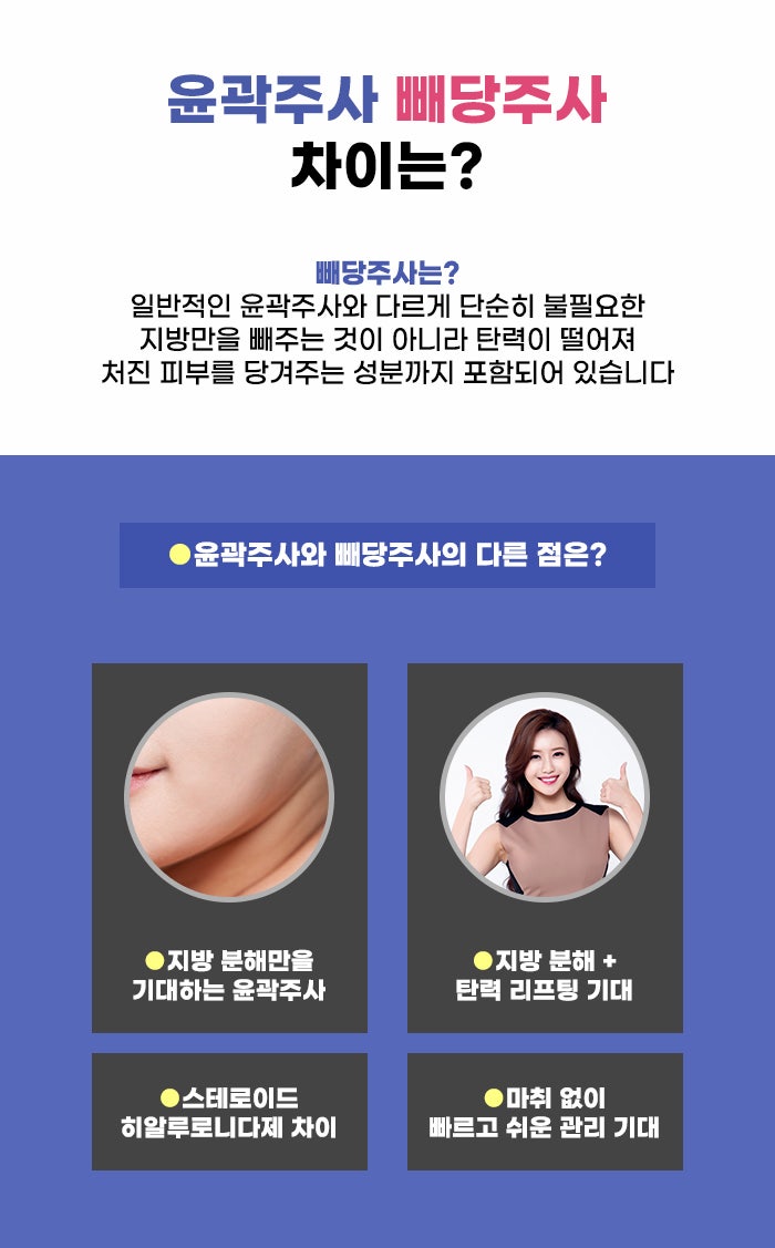 얼굴 살을 빼고 싶을 때 윤곽주사에 대해서 알아볼 수 있는데요. 보통의 윤곽주사와 다른 장점을 가진 빼당주사 관리가 주목받고 있기도 합니다. 윤곽주사 병원 추천 알아보는 분의 경우 얼굴의 지방을 줄이고 싶어서 찾는 경우가 많을 것 같습니다. 그런데 일반적인 윤곽주사는 턱살, 볼살 등의 불필요한 지방을 줄이는 데 도움을 기대할 수도 있지만, 탄력에는 별다른 도움이 되지 않는 편이라고 알려져 있습니다.