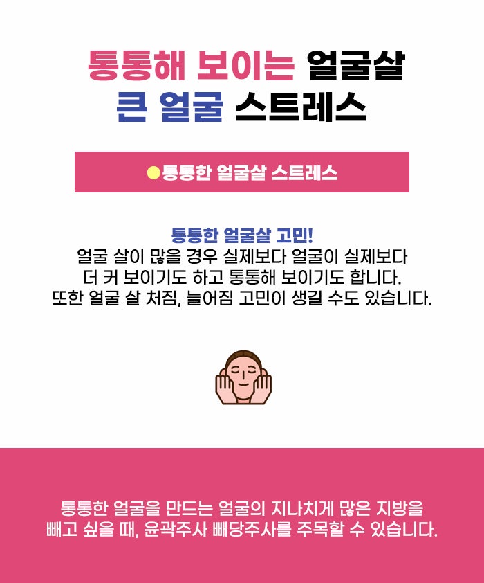 문제는 사람마다 체형이 다른 것처럼, 얼굴에 있는 살도 개인마다 다를 수 있다는 점입니다. 같은 키, 같은 체중을 가진 모든 사람의 체형이 똑같지 않은 것과 같이, 비슷한 체중이어도 볼살이 많은 분, 턱살이 많은 분이 있습니다. 또 원하는 부위에는 지방이 별로 없지만, 얼굴의 턱, 심부볼 같은 부분에 지방이 많아 스트레스인 분도 있습니다.