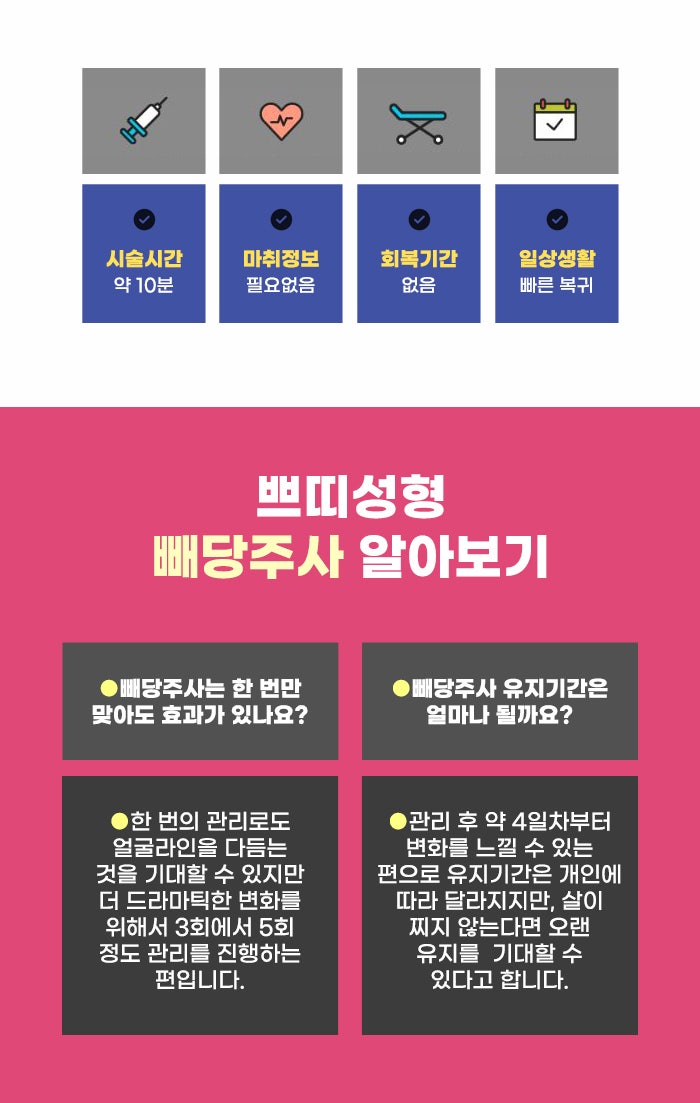 통증이 심한 경우 강한 마취를 해야 하고, 또 통증 부담에 더해 마취에 대한 걱정도 생길 수 있습니다. 그런데 빼당주사의 경우에는 마취를 하지 않고 진행하기도 하는데요. 따로 마취를 하고 견뎌야 할 정도로 긴 관리 시간, 강한 통증 부담이 적은 편이라고 생각됩니다. 그리고 관리 후 오래 회복기간을 가질 필요가 없다고 합니다.