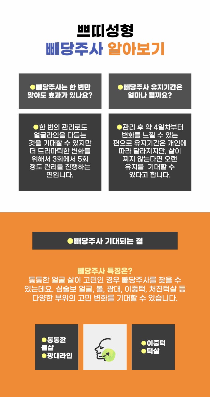 얼굴에 지방이 있을 때, 탄력적으로 붙어 있고 원래 있어야 하는 자리에 있다면 고민이 크지 않지만, 얼굴에 있는 살이 처지고 늘어지며, 피부 늘어짐과 함께 더 눈에 띄기도 합니다. 이런 경우 갑자기 나이 들어 보이기도 하고, 얼굴선이 울퉁불퉁해 보일 수도 있습니다. 빼당주사는 보통 윤곽주사와 다르게 탄력이 떨어진 피부를 당겨주는 변화를 기대할 수도 있다고 합니다.