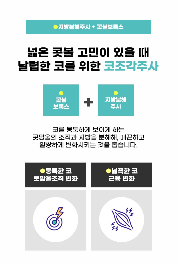 콧볼 보톡스는 콧볼을 넓어 보이도록 하는 근육을 축소하는 걸 기대할 수 있습니다. 그리고 지방분해주사는 코를 뭉툭하고 둔해 보이도록 하는 콧망울의 조직, 지방 등을 분해하는 것을 기대할 수도 있다고 합니다. 코조각주사는 지방분해주사의 특징, 그리고 콧볼 보톡스의 특징을 합한 것이라고 알려져 있습니다.
