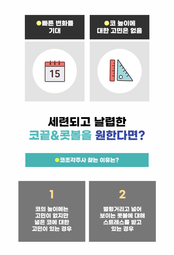 세련된 분위기를 갖기 위해, 내가 원하는 모습에 가까워지기 위해서 강남 코조각주사 추천 정보 찾는 분이 적지 않다는 생각이 듭니다. 특히 기존에 코 모양에 대한 콤플렉스를 갖고 있던 분이라면 코조각주사 과정을 통해 새로운 자신감을 얻게 될 수도 있는데요, 얼굴형, 코 모양과 조직 특징 등을 복합적으로 고려해 균형 있는 아름다움을 찾으셨으면 합니다.
