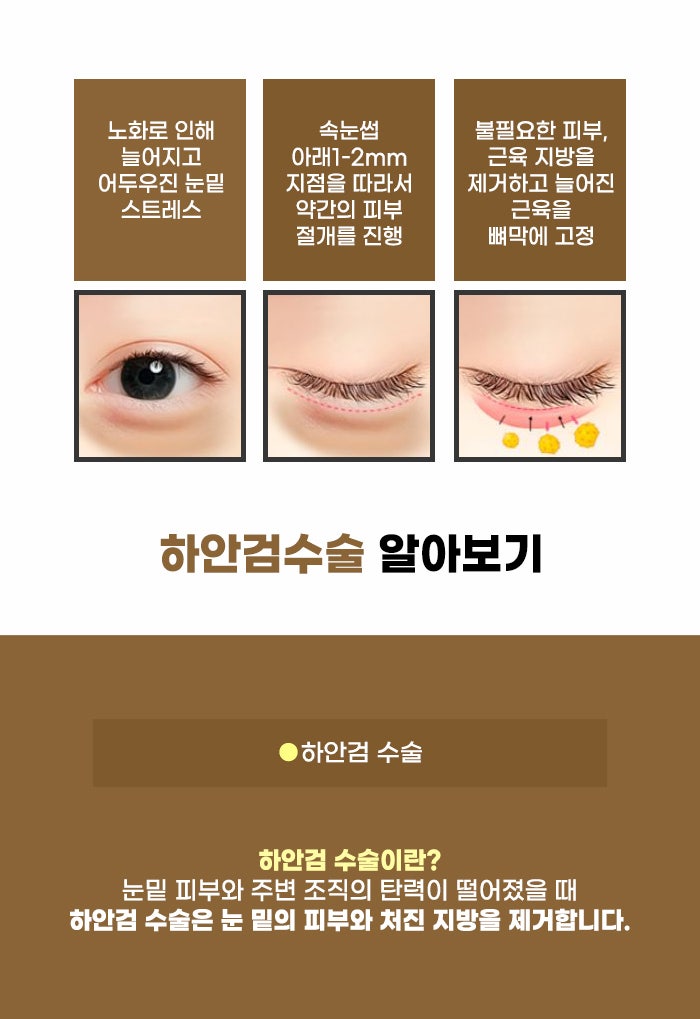 이때 지방을 없앨 경우 당연히 피부가 축 늘어지고 주름이 더 강해 보일 수도 있습니다. 이미 눈 밑이 피부 처짐, 주름이 강하게 자리를 잡고 있는 상황인지 확인해야 하는데요, 이런 상황이라면 불필요한 조직을 절제하고, 필요하지 않은 부분을 절개 후 봉합하는 하안검 수술을 찾기도 합니다. 하안검 수술 과정은 단기 수면마취를 통해 진행되는 편이라고 하는데요. 실밥 제거는 1주일 뒤에 하는 편이라고 합니다.