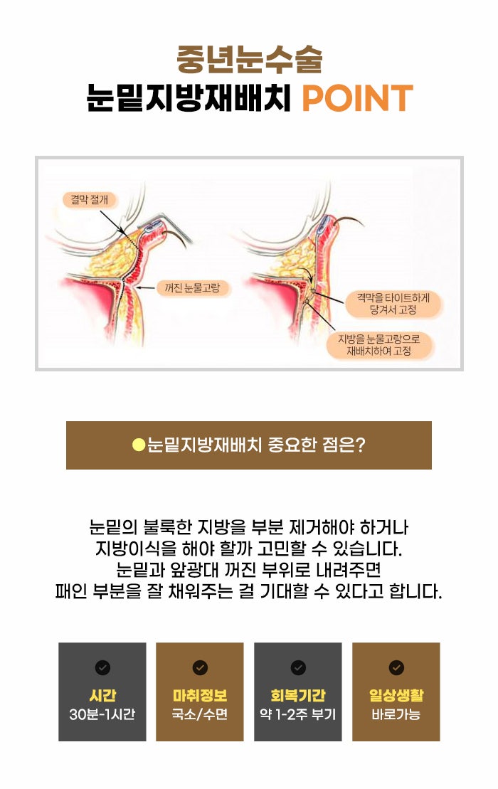 현재는 중년은 당연하고, 과거에는 노년층이었던 나이에서도 활발하게 활동하는 분이 많습니다. 건강하고 활력있는 일상을 보내고 있는 만큼, 외모 역시 꾸준히 가꾸고 자신감 있는 모습을 보여주고 싶어 하는 분이 늘어나는 것 같습니다. 그런데 중년 나이가 되면서 눈 주위의 피부가 처지거나 눈 밑의 함몰이 더 뚜렷해질 수 있는데요. 이런 이유로 강남 눈밑지방재배치 비용 정보 찾아보고 결심을 하기도 합니다.