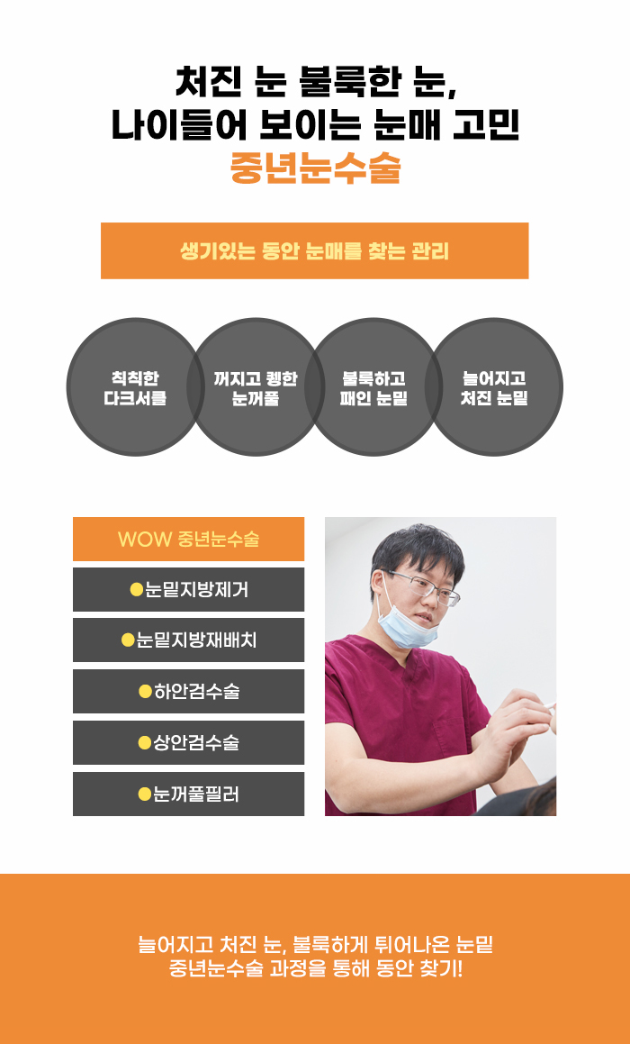 이런 고민은 주로 30대 이후를 지나, 중장년층이 많이 하는 편입니다. 그리고 고령층이 될수록 이런 고민이 뚜렷해질 수도 있습니다. 그렇기에 중년을 위한 눈수술을 진행하고 싶어 하는 분도 많은데요, 늘어진 윗눈꺼풀을 절개하고 봉합하거나, 눈 밑의 하안검 부분이 늘어지고 처지며 주름이 많이 생긴 경우 하안검 수술을 찾는 분도 있습니다. 또한 눈 밑의 지방이 처지거나 패인 경우 눈밑지방제거, 눈밑지방재배치 등을 진행하기도 합니다. 나의 눈 고민에 따라서 적절한 관리 방법이 달라질 수 있기에 이 점을 고려해 관리를 해야 합니다.