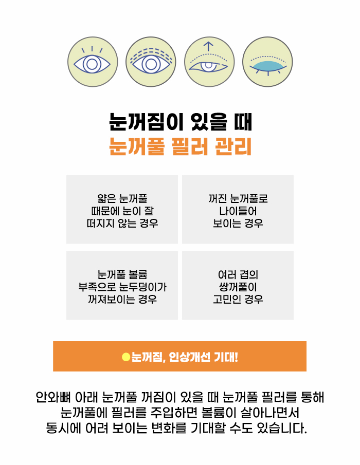 눈꺼풀에 있는 볼륨이 줄어들면서 다양한 고민이 생길 수도 있는데요, 나이 들어 보이는 인상으로 스트레스를 받기도 하고 짝눈, 겹쌍꺼풀 같은 문제가 생겨 고민하기도 합니다. 또한 눈을 뜨는 힘이 약해지는 경우도 있습니다. 그리고 눈꺼풀의 볼륨이 꺼지는 것과 별개로 눈꺼풀이 늘어지고 처지는 게 고민이 되는 경우도 있습니다. 눈꺼풀 꺼짐이 있을 때 필러로 볼륨을 채울 경우 볼륨이 살아나고 어려 보이는 것을 기대할 수도 있다고 합니다.