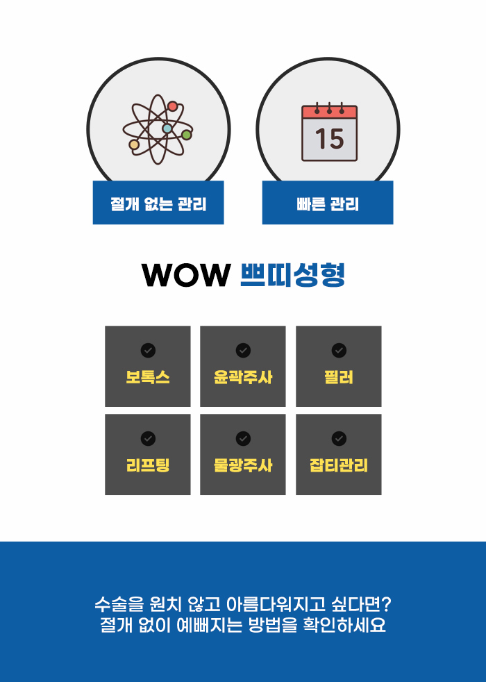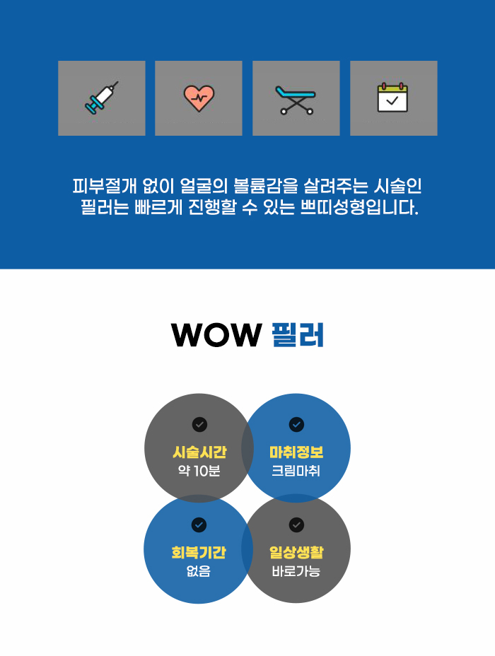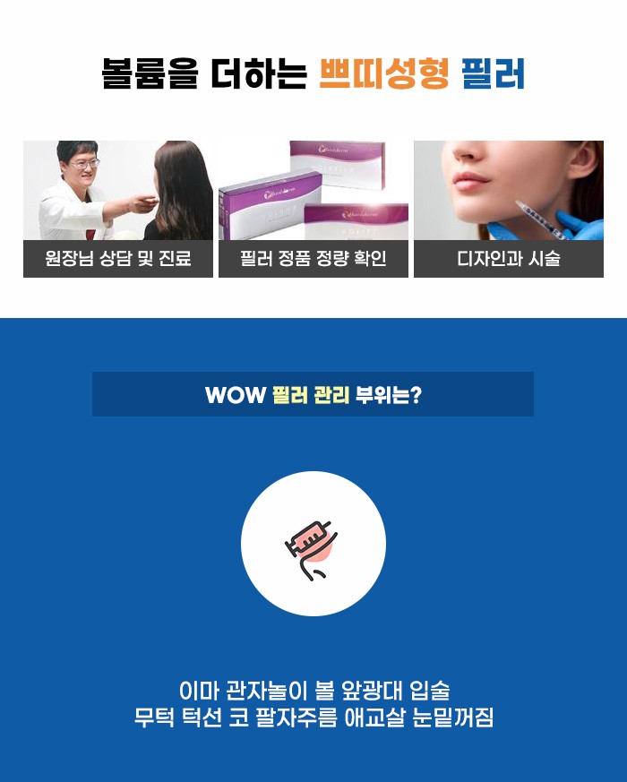 쁘띠성형 중 대표적인 관리인 필러는, 빠르게 변화를 느낄 수 있으며 절개를 하는 게 아니라 간단하게 주사 관리로 진행할 수 있다는 장점이 있습니다. 하지만 세부적인 과정, 부기, 결과 등은 개인별로 다를 수 있기에 꼼꼼히 확인해 자신감 있는 변화를 누리셨으면 합니다!
