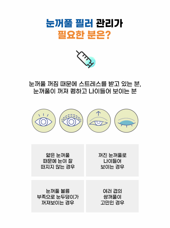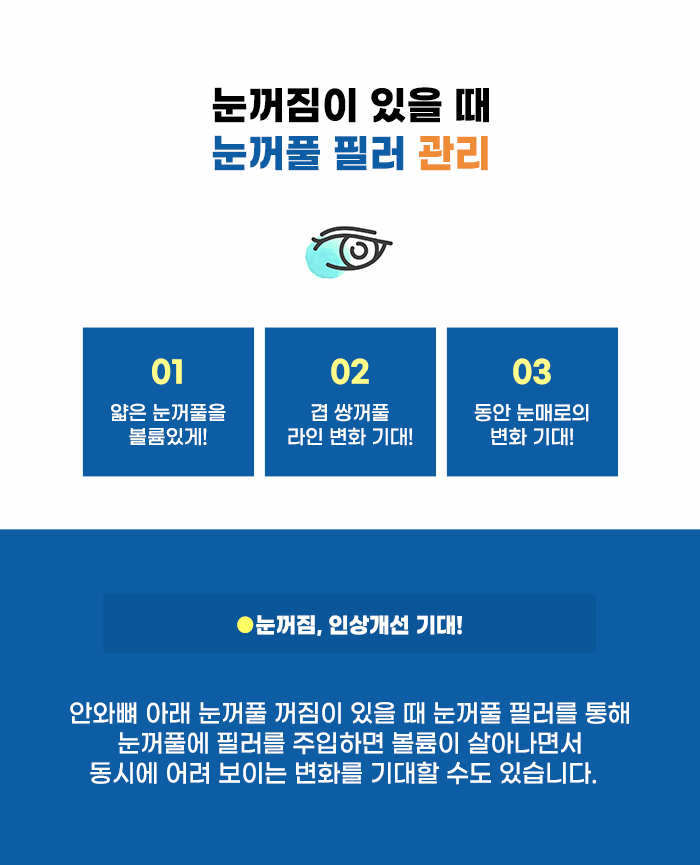 눈꺼풀 필러는 안와뼈 아랫부분, 쌍꺼풀 라인 위쪽 부분의 눈꺼풀이 꺼졌을 때, 필러를 이용해 볼륨을 넣어주는 관리라고 합니다. 눈꺼풀의 볼륨이 줄어들 경우 눈매에 변화가 생기고 어두워 보이기도 하며, 짝눈, 겹 쌍꺼풀 같은 고민이 생기기도 합니다. 이럴 때 균형 있고 자연스러운 동안 눈매를 갖는 데 도움을 받는 것을 기대할 수 있는 방법이 바로 눈꺼풀 필러라고도 할 수 있겠습니다.
