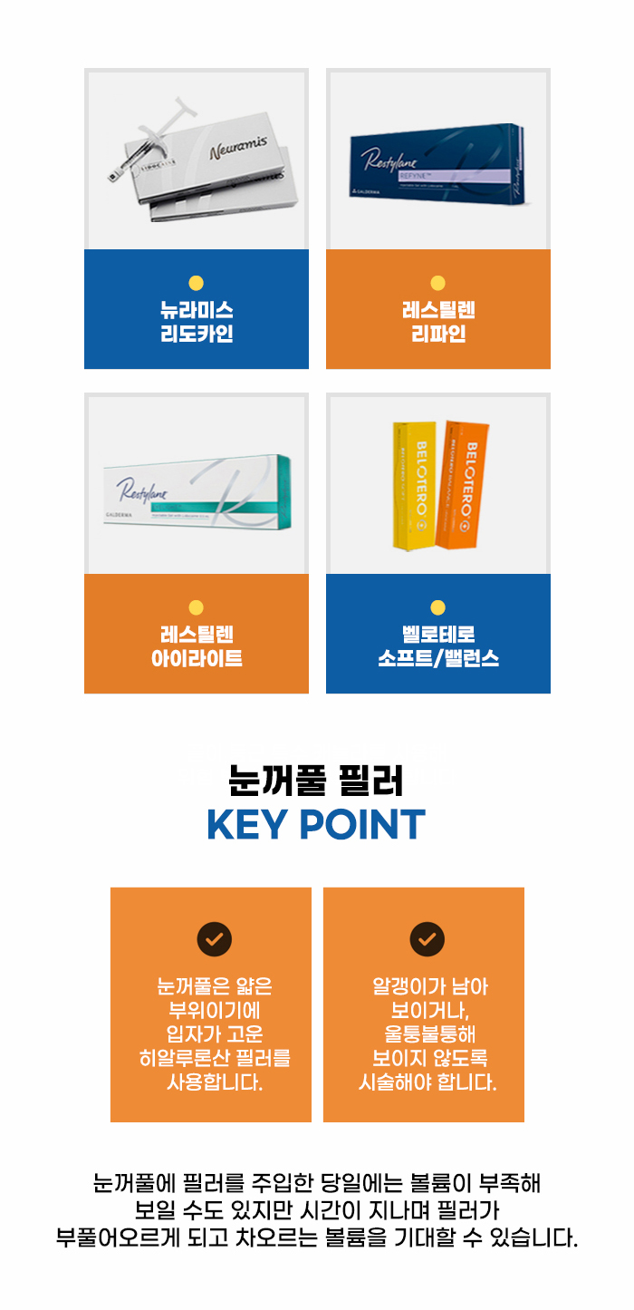 눈꺼풀 필러 관리의 경우 레스틸렌 리파인이나 레스틸렌 아이라이트, 벨로테로 소프트와 밸런스, 그리고 뉴라미스 리도카인 등의 필러를 이용하는 경우가 많다고 하는데요, 입자가 고운 필러를 정품, 정량 사용해야 하겠습니다. 또한 강남 리아이필러 잘하는곳 정보 찾는 분의 경우 얼굴의 다른 부위 필러 관리를 원하는 분도 있을 것 같은데요, 시너지를 낼 수 있는 관리를 시행할 수 있는지 확인하셨으면 합니다.