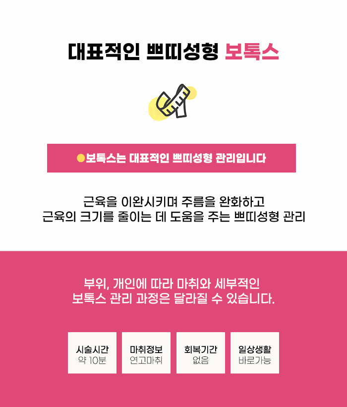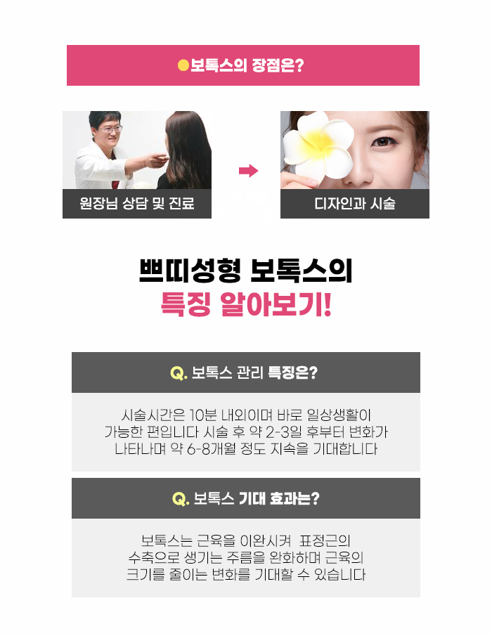 갸름하고 비율좋은 턱선 모양을 갖기 위해서 턱끝 부분이 날렵함을 더하기도 하지만, 턱근육이 커서 턱 자체가 넓고 강해 보이는 경우 보톡스 관리를 진행하는 경우도 있다고 합니다. 보톡스 역시 필러 관리처럼 대표적인 쁘띠성형 관리로 알려져 있다고 합니다. 보톡스의 경우 관리 시간은 약 10분 정도이며 연고마취를 하고 진행하는 편입니다. 또한 따로 긴 휴식기간을 가질 필요가 없다고 알려져 있습니다.