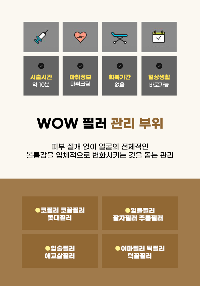 필러는 대표적으로 알려진 쁘띠성형 관리 중 하나입니다. 쁘띠성형은 성형과 작다, 귀엽다라는 뜻을 가진 쁘띠가 더해진 말로, 수면 마취나 전신 마취, 절개 등을 하는 성형 수술 방식과 다르게 주사 관리 등 간단한 방법으로 아름다움을 찾을 수 있는 관리를 말하는데요. 필러 관리는 주사 관리로 진행된다고 하며 피부의 절개를 하지 않고 얼굴의 볼륨감을 살펴주는 관리로 알려져 있다고 합니다.