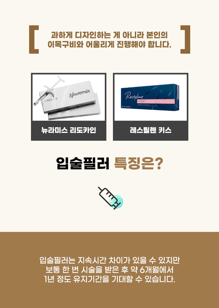 또한 균일한 입자의 안정화 공법을 통해 단단한 젤 질감의 점탄성을 기대할 수 있는 필러 제품이 레스틸렌 키스라고 합니다. 입술은 움직임이 많은 부분이며, 감각적으로도 예민한 부분이기도 합니다. 이런 점을 고려해 섬세한 입술 필러 관리를 하는 게 중요하겠습니다. 제품, 개인에 따라서 지속 기간 차이가 있는데요, 보통 6개월에서 1년 정도 유지를 기대할 수도 있다고 합니다.