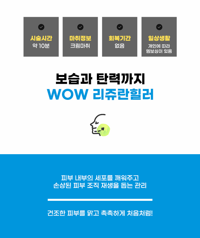 리쥬란 힐러는 관리를 진행할 때 빠르게 진행할 수도 있다는 장점이 있는데요. 따로 회복기간을 오래 가질 필요가 없으면서 관리 시간은 약 10분 정도로 빠르게 할 수도 있다 보니 쉽게 결정할 수도 있습니다. 다만 관리 후 개인 피부에 따라서 다르지만 엠보싱 현상, 부기 등에 대한 걱정이 있을 수도 있으니 이 점에 대해서 충분히 설명을 듣고 나에게 맞는 관리를 결정해야 하겠습니다.