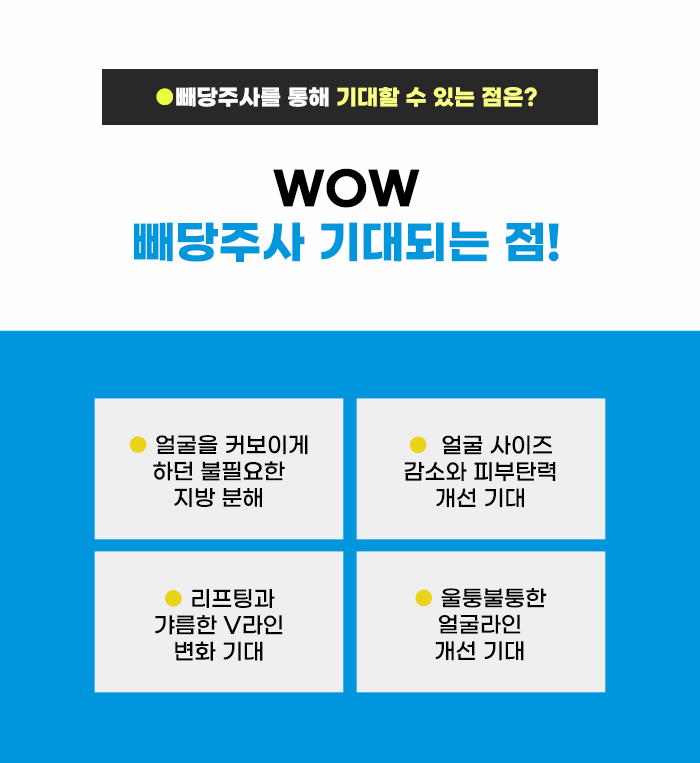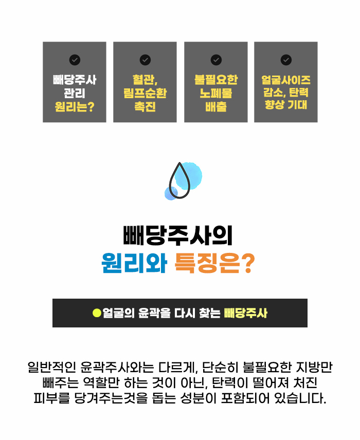 특히 턱선 처짐, 턱살과 이중턱에 대한 고민이 있는 경우에는 얼굴선에 대한 고민이 클 수 있는데요, 늘어진 턱살로 인해 턱선이 매끄럽지 않고 얼굴선이 울퉁불퉁해 보이기도 합니다. 이럴 때 빼당주사는 윤곽주사와 다르게 리프팅을 함께 도와서 더 날렵한 얼굴선을 갖는 데 도움을 줄 수도 있다고 합니다.