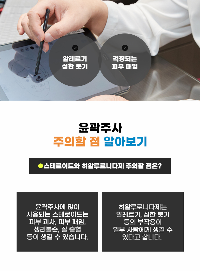 스테로이드 성분의 경우 일부 사람에게 피부 괴사, 패임 등의 문제를 불러오기도 하며, 질 출혈, 부정 출혈 등의 문제를 불러오는 경우도 일부 있다고 합니다. 또한 히알루로니다제의 경우에도 심한 알레르기나 심한 부기 등의 문제를 일부 사람에게 가져올 수도 있다고 하는데요. 애초에 이런 성분이 없는 관리를 진행한다면 해당 성분으로 인한 어려움을 줄일 수 있습니다.