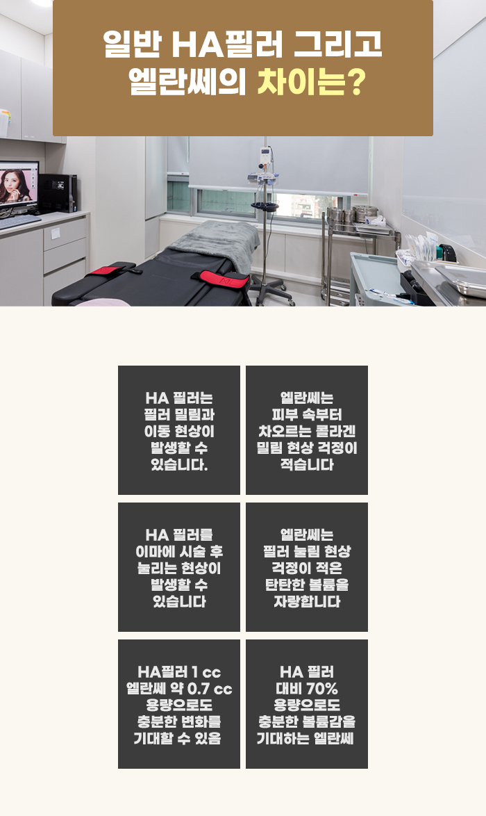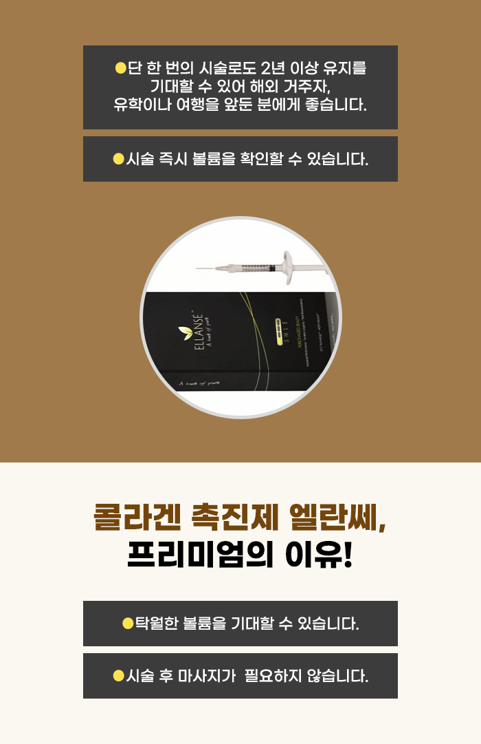 특히 우리나라에 계속 거주하는 분의 경우, 원하는 때 빠르게 필러 관리를 다시 받을 수도 있습니다. 하지만 해외에 거주하다가 한국에 방문하는 분의 경우에는 원할 때 쉽게 필러나 쁘띠성형 관리를 받는 게 힘들 수 있는데요. 하지만 엘란쎄의 경우 더 오랜 유지를 기대할 수 있는 관리입니다. 그렇기에 관리를 받고 출국 후 오랜 시간 자신있는 볼륨 유지를 도울 수도 있다고 합니다.