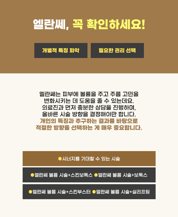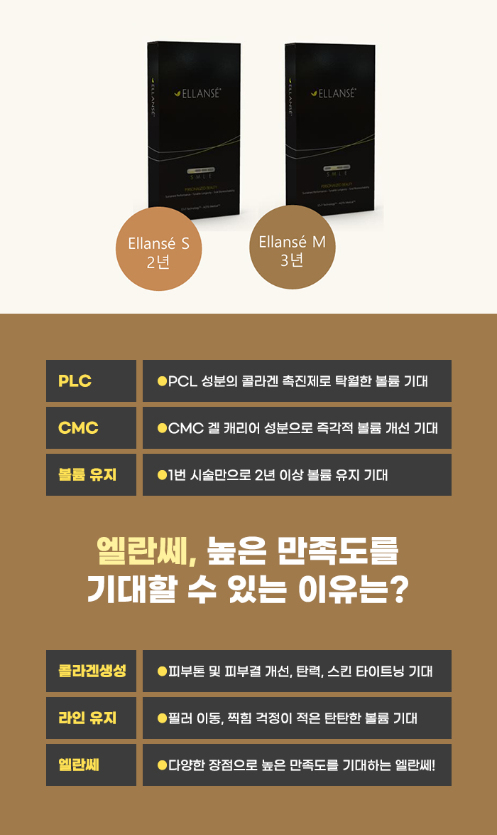 일반 필러의 경우 시간이 지나면서 밀림이 생길 수도 있고 찍힘이 생기는 게 아닐까 걱정될 수 있습니다. 하지만 콜라겐 형성을 기대하는 엘란쎄는 더 견고하게 자연스러운 볼륨 유지를 기대할 수 있는 편인데요, 그렇기에 찍힘이나 밀림에 대한 부담을 덜 가질 수 있습니다.