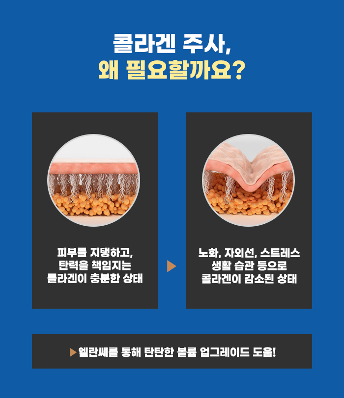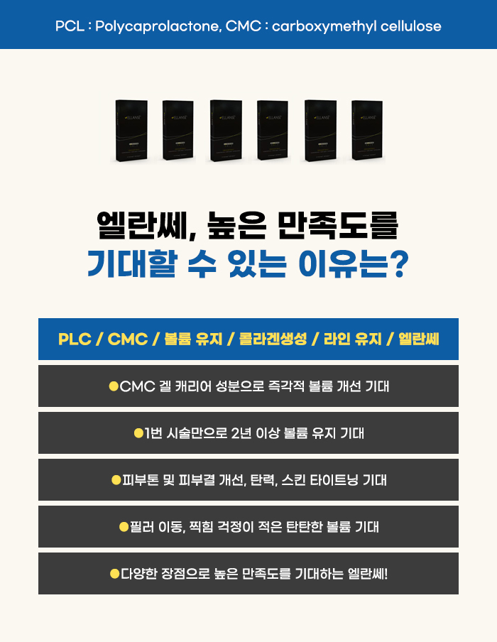 엘란쎄는 겔 캐리어 성분을 갖고 있는데요, CMC 성분은 즉각적인 볼륨을 형성하는 것을 기대할 수 있는 성분이라고 하며, PCL 성분의 경우 콜라겐을 생성하는 데 도움을 주는 씨앗 역할을 한다고 볼 수도 있습니다. 그렇기에 탄탄한 볼륨 형성을 기대할 수도 있다고 합니다.