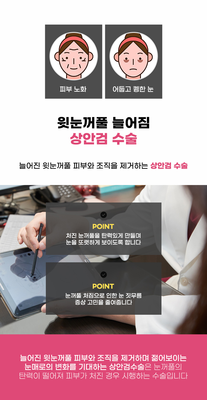 노화로 인해 눈꺼풀이 처지고 늘어질 수 있는데요, 눈 윗꺼풀인 상안검이 처질 경우 눈매와 관련된 기능적 고민, 미적 고민이 생기게 됩니다. 우선 눈매가 답답해 보일 수 있고 처진 눈으로 갑자기 나이가 들어 보일 수도 있습니다. 또한 눈꺼풀이 처지면서 쌍꺼풀이 풀리는 경우도 있습니다. 눈은 마음의 창이라는 별명이 있을 정도로 사람이 감정과 생각을 나타내는 부분인데요.