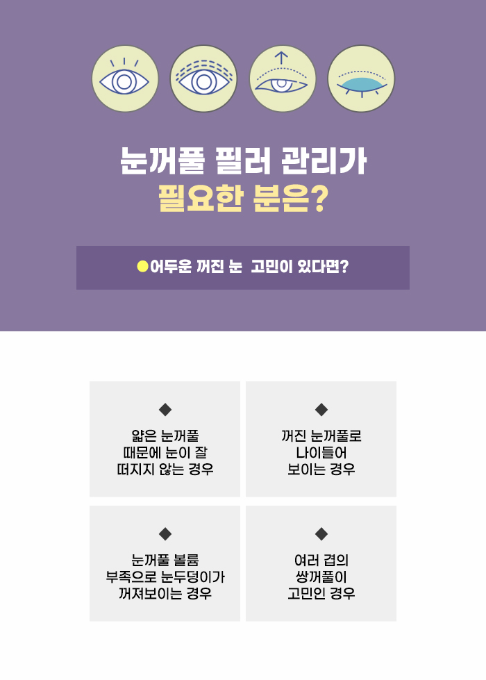이런 상황에서 눈꺼풀 필러 관리는 쌍꺼풀 라인 위쪽, 안와뼈 경계를 따라 그 아래쪽인 눈꺼풀에 볼륨을 더해주면서 더 어려 보이고 생기있어 보이는 눈매를 가지는 데 도움을 줄 수도 있다고 합니다. 눈꺼풀 필러 관리의 경우 관리 시간이 짧은 편이면서 마취에 대한 부담도 적은 관리인데요, 그렇다 보니 많은 분이 쉽게 이 필러 관리를 결정하고 있습니다.