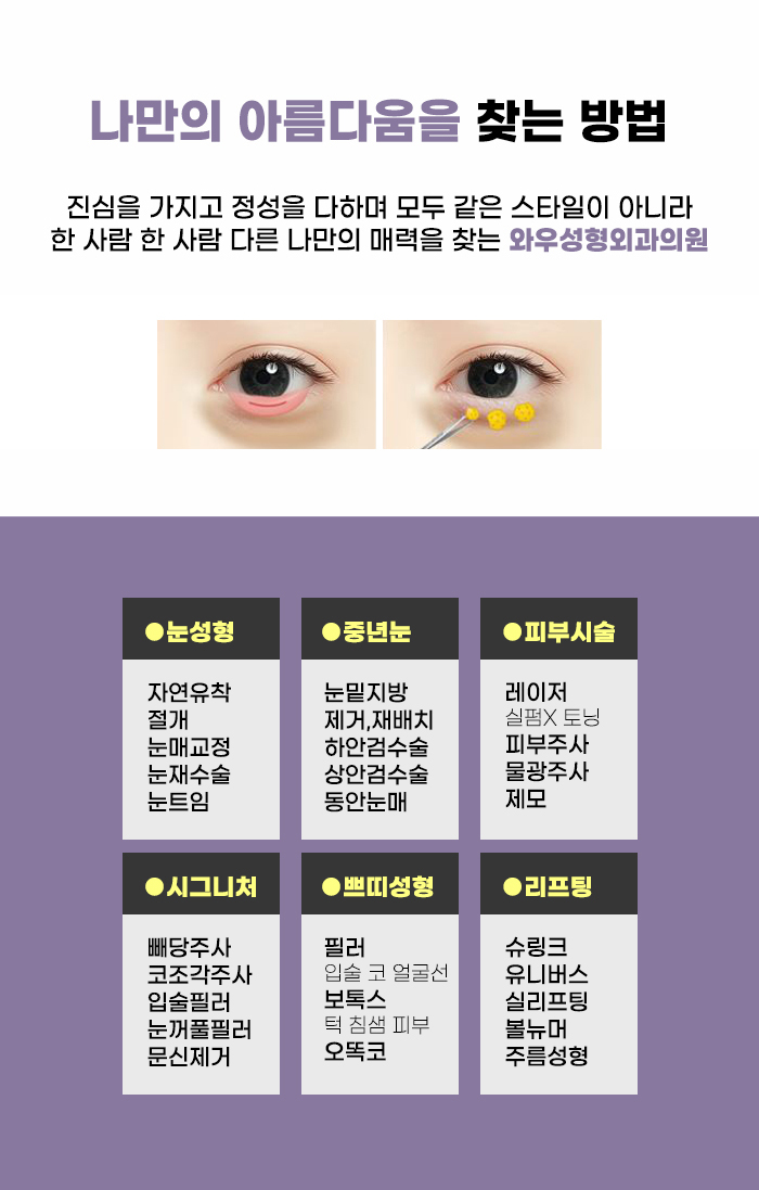 끝이 둥근 캐뉼라를 사용해 세밀한 관리를 하는 곳인지도 알아보셨으면 합니다. 또한 현재의 내 눈매에 대해서 다른 고민이 있는 경우도 있을 수 있는데요, 눈꺼풀의 처짐, 늘어짐이 있고 눈 짓무름이 생긴 경우나 혹은 하안검 부분의 주름, 늘어짐이 고민이 되는 경우, 혹은 눈 밑 지방이 불룩하게 튀어나와 보이거나, 패임이 발생한 경우 등의 고민이 있다면 이에 맞는 관리 과정을 알 수 있었으면 합니다!