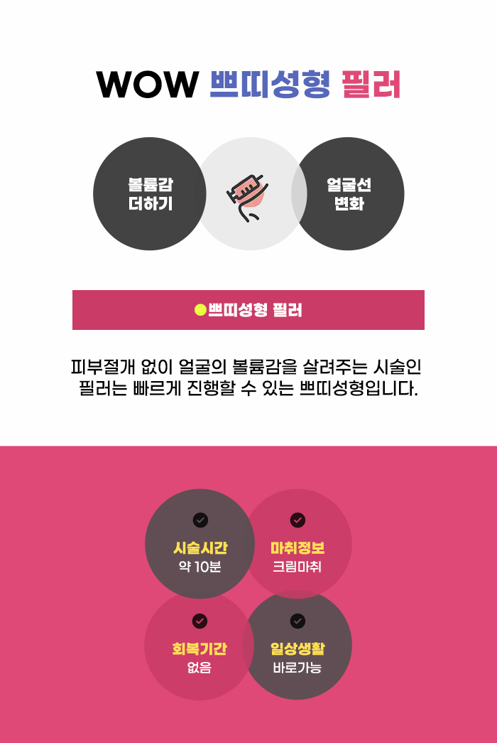 필러는 대표적인 쁘띠성형 관리 중 하나로 사람들에게 알려진 관리입니다. 주사 관리로 볼륨이 필요한 곳, 패임이 발생한 곳, 점점 주름이 깊어지는 곳 등에 빠르게 볼륨을 추가할 수도 있다는 장점이 있는데요, 기존에 성형수술을 원하지 않는 분의 경우나 혹은 수술을 하기 힘든 경우, 수술 후에 보완을 위해 쁘띠성형을 찾는 경우에도 필러 관리를 결정하고 있습니다.