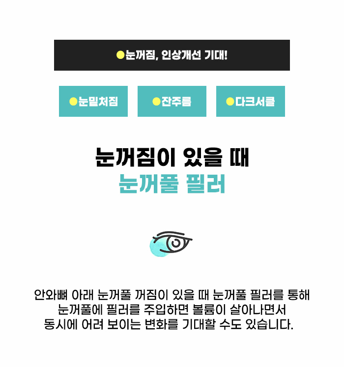 얇은 눈꺼풀 때문에 눈이 어둡고 퀭해 보이는 경우에 속하거나 혹은 눈이 잘 떠지지 않는 경우 눈꺼풀 필러 관리를 결정할 수 있다고 하는데요, 안와뼈 경계를 따라서 그 아래쪽의 볼륨이 줄어든 눈꺼풀 꺼짐은 나이 들어 보이는 인상을 만들기도 하고 눈 양쪽 균형이 맞지 않는 짝눈, 혹은 겹쌍꺼풀 문제를 불러오기도 합니다.