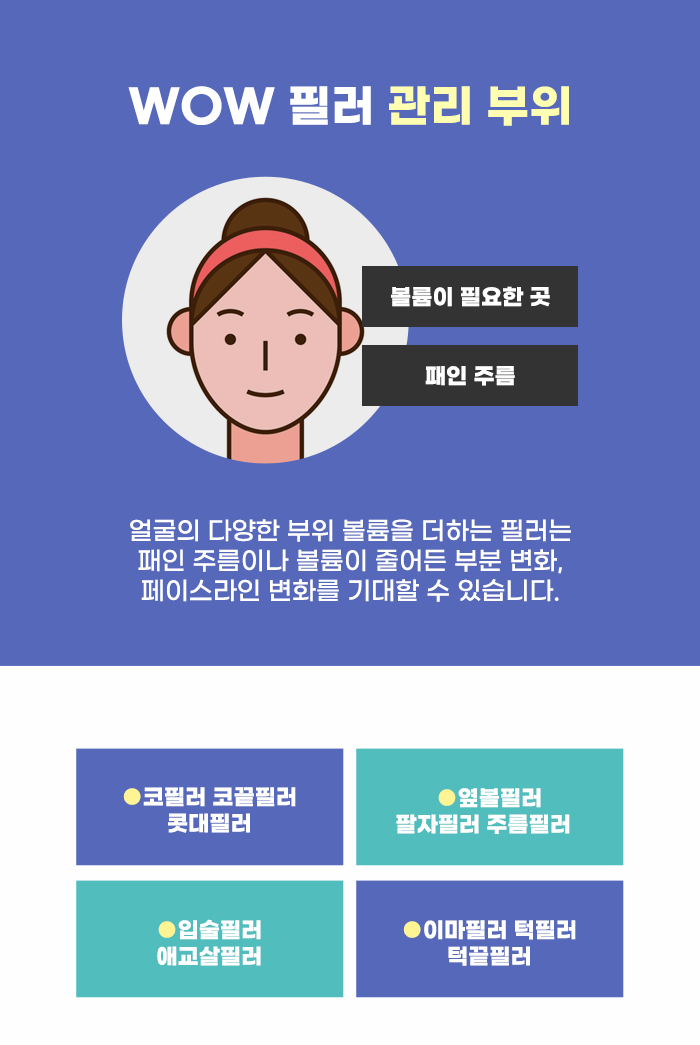 필러 관리를 진행하는 부분은 얼굴인데요, 얼굴의 다양한 부분에 필러 관리를 진행할 수 있다고 합니다. 입술필러의 경우에는 도톰한 입술, 생기 있고 트렌디한 이미지를 갖기 위해서 선택하고 있습니다. 이마필러는 고급스러운 이미지와, 얼굴 전체적으로 볼륨 있는 선을 갖기 위해서 관리를 선택하기도 합니다. 또한 옆 볼의 꺼짐이 있을 때 광대가 더 부각되어 보이고 얼굴선이 울퉁불퉁해 보일 수도 있습니다.