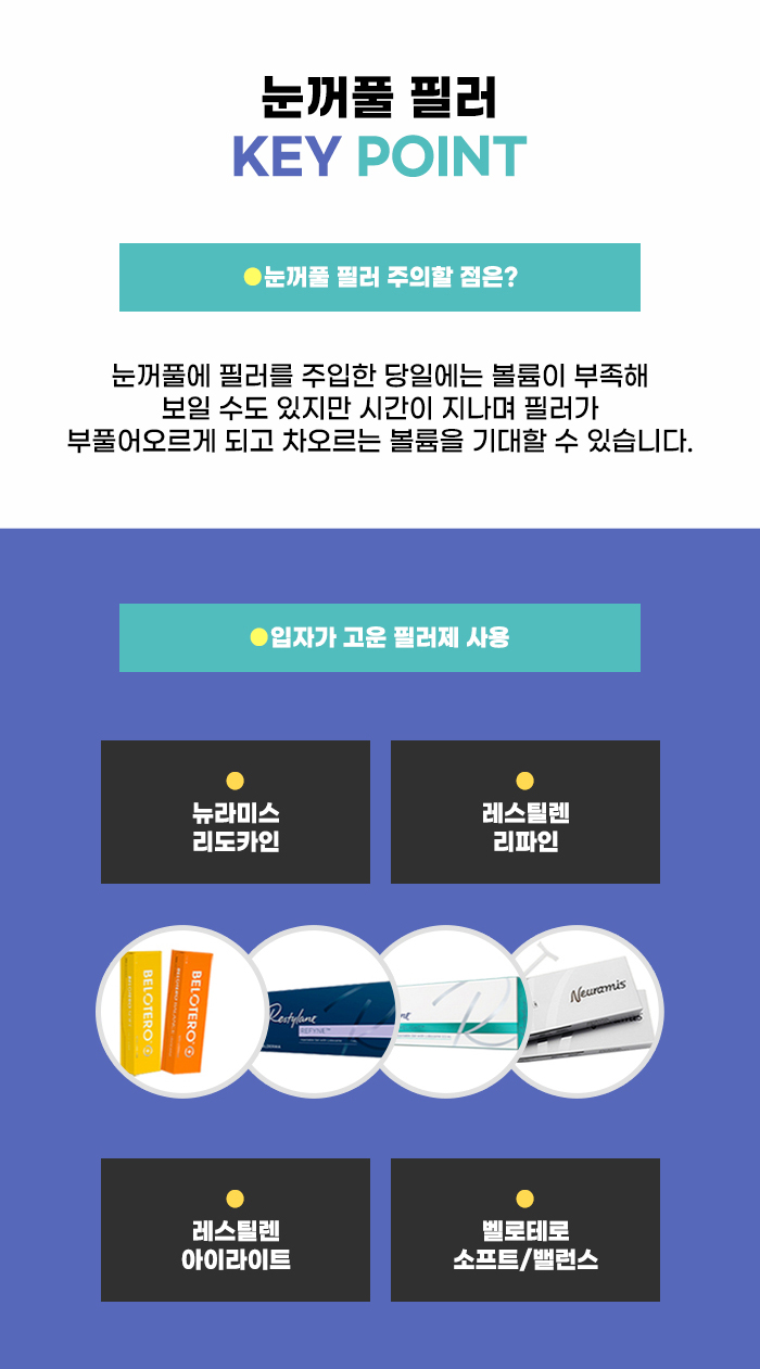 눈꺼풀은 피부가 얇은 부분입니다. 또한 움직임이 많고 예민한 부분이기도 합니다. 그렇기에 입자가 고운 필러를 이용해야 한다고 하는데요, 뭉치지 않고 고르고 균형 있는 관리를 하는 것도 필요합니다. 뉴라미스 리도카인, 레스틸렌 리파인, 레스틸렌 아이라이트, 벨로테로 소프트/밸런스 등이 눈꺼풀 필러 관리를 위한 필러제로 이용되고 있다고 합니다.