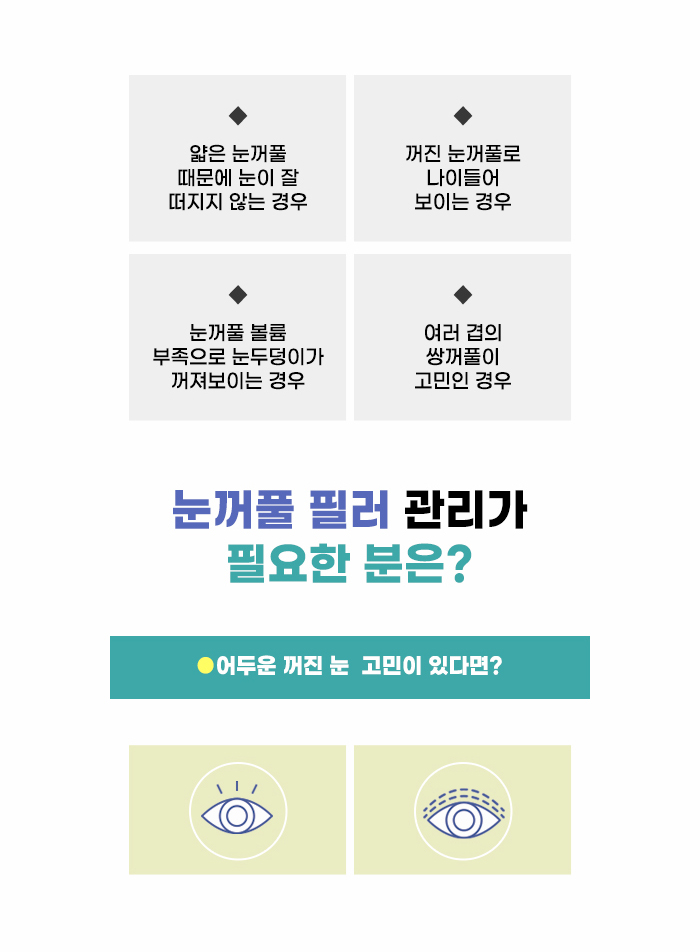 눈두덩이에 있던 볼륨이 사라질 경우 더 나이 들어 보이기도 하고, 겹쌍꺼풀이 되기도 합니다. 한쪽 눈에만 겹쌍꺼풀이 생기고 다른 쪽 눈은 그렇지 않은 경우에는 짝눈처럼 보이는 것에 대한 고민이 생기기도 합니다. 이렇게 눈꺼풀 꺼짐이 있을 때 눈꺼풀 필러 관리는 간편하게 볼륨을 더하는 방법으로 알려지고 있습니다.