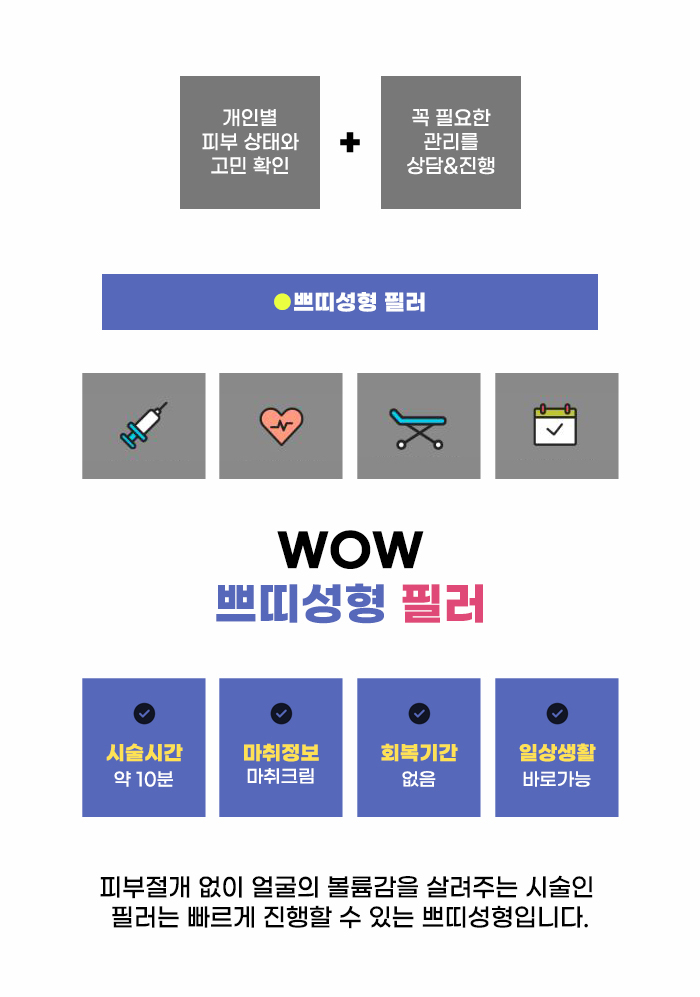 그리고 쁘띠성형 중 필러는 많은 분이 찾는 관리인데요, 즉각적인 변화를 느낄 수 있다는 게 쁘띠성형 필러 관리의 중요한 장점인 것 같습니다. 필러 관리는 주사 관리로 오랜 회복기간을 거쳐야 할 필요 없이, 관리를 받고 난 후에 보통의 일상적 활동을 할 수 있는데요, 음주나 무리한 활동은 잠시 금해야 하지만, 직장인이나 학생도 쉽고 편리하게 관리를 받을 수도 있습니다.