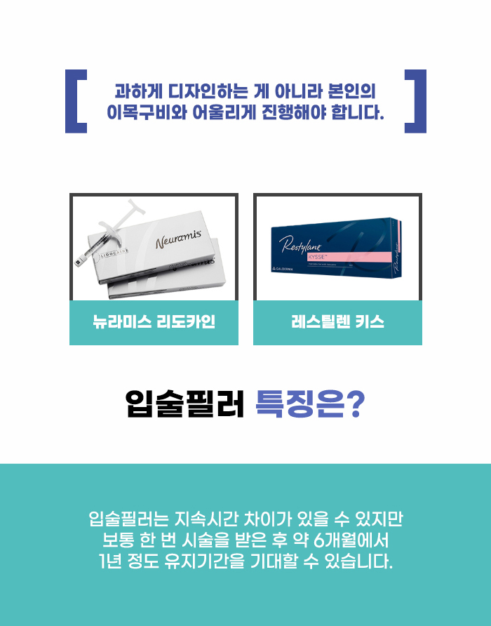 입술필러에 많이 이용되는 필러제의 경우 뉴라미스 리도카인이 있으며 레스틸렌 키스가 있다고 합니다. 뉴라미스 리도카인의 경우, 2차례의 가교결합으로 긴 유지기간을 기대할 수도 있다는 점, 통증이 덜한 편이라는 장점이 있으며, 레스틸렌 키스의 경우 단단한 젤 질감의 점탄성이 특징이라고 하는데요.