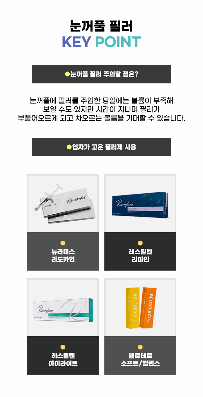 리아이필러 효과 찾는다면, 어떤 필러제를 이용하는것인지도 아셨으면 하는데요, 눈꺼풀 필러의 경우 눈꺼풀이라는 부분에 맞는 필러제를 결정해야 합니다. 레스틸렌 아이라이트, 벨로테로 소프트/밸런스 그리고 뉴라미스 리도카인, 레스틸렌 리파인 등의 필러제를 선택하는 경우가 많다고 하는데요, 입자가 고운 필러를 이용해 균형 있고 자연스러운 차이를 만들어내야만 하겠습니다.