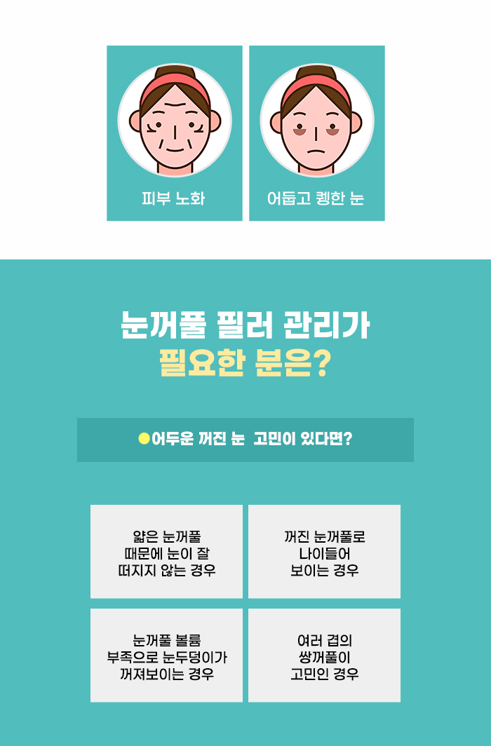 눈가의 피부는 얇고, 지방층도 적은 부분입니다. 또한 움직임도 많은 부분이기도 합니다. 개인에 따라서 눈을 비비고 눈가 피부에 강한 자극을 주는 습관을 가진 분의 경우 더욱 빠르게 눈매 노화가 찾아올 가능성도 있습니다. 그렇다 보니 눈매의 피부 노화, 처짐, 늘어짐 등으로 인해서 스트레스를 받는 상황인 분도 많은 것 같습니다. 눈꺼풀 필러는 노화가 진행되며 어두워 보이고 퀭한 눈매 고민을 바꿀 수도 있습니다.