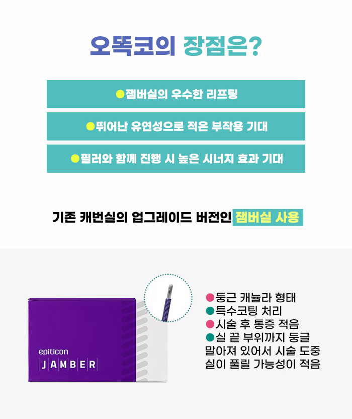 둥근 캐뉼라 형태이면서 실 끝부분까지 둥글게 말아져 있고 유연한 실이 잼버실이라고 하는데요, 오똑코 관리에 이용되는 잼버실은 특수코팅 처리를 하고 콜라겐을 촉진하는 스프링 모양이라고 합니다, 유연한 실이다 보니 관리 후에 통증이 심하게 느껴지거나 시술 시 실이 분리되는 것에 대한 부담도 적은 편이라고 합니다.