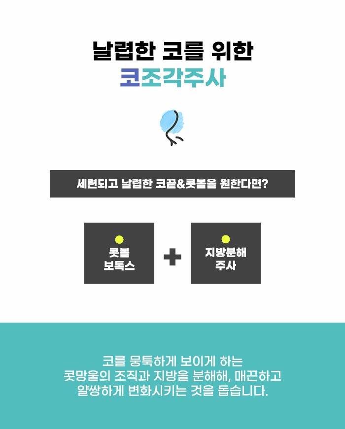 코를 더 넓어 보이고 퍼져 보이도록 하는 콧망울의 조직과 지방을 분해하는 성분을 사용한다고 하는데요, 주사 관리로 간편하게 콧볼을 넓어 보이도록 하는 조직과 지방을 줄이고, 또 근육을 콧볼 보톡스를 통해 축소하게 될 수도 있다고 합니다. 개인이 갖고 있는 코 모양이나 지방, 근육의 양 등이 다르기에 충분하게 상담 후에 관리를 선택해야 하겠습니다.