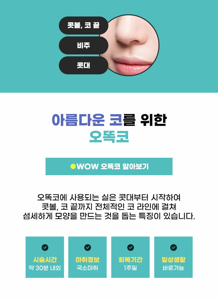 기존에 콧대의 높이가 낮고 입체감이 부족한 경우에는 오똑코 관리를 결정하기도 합니다. 또한 기존에 코필러 관리를 받았는데 퍼지고 모양이 뭉툭하게 변한 경우에도 오똑코 관리의 장점에 대해서 궁금해하는 경우가 있다고 합니다.