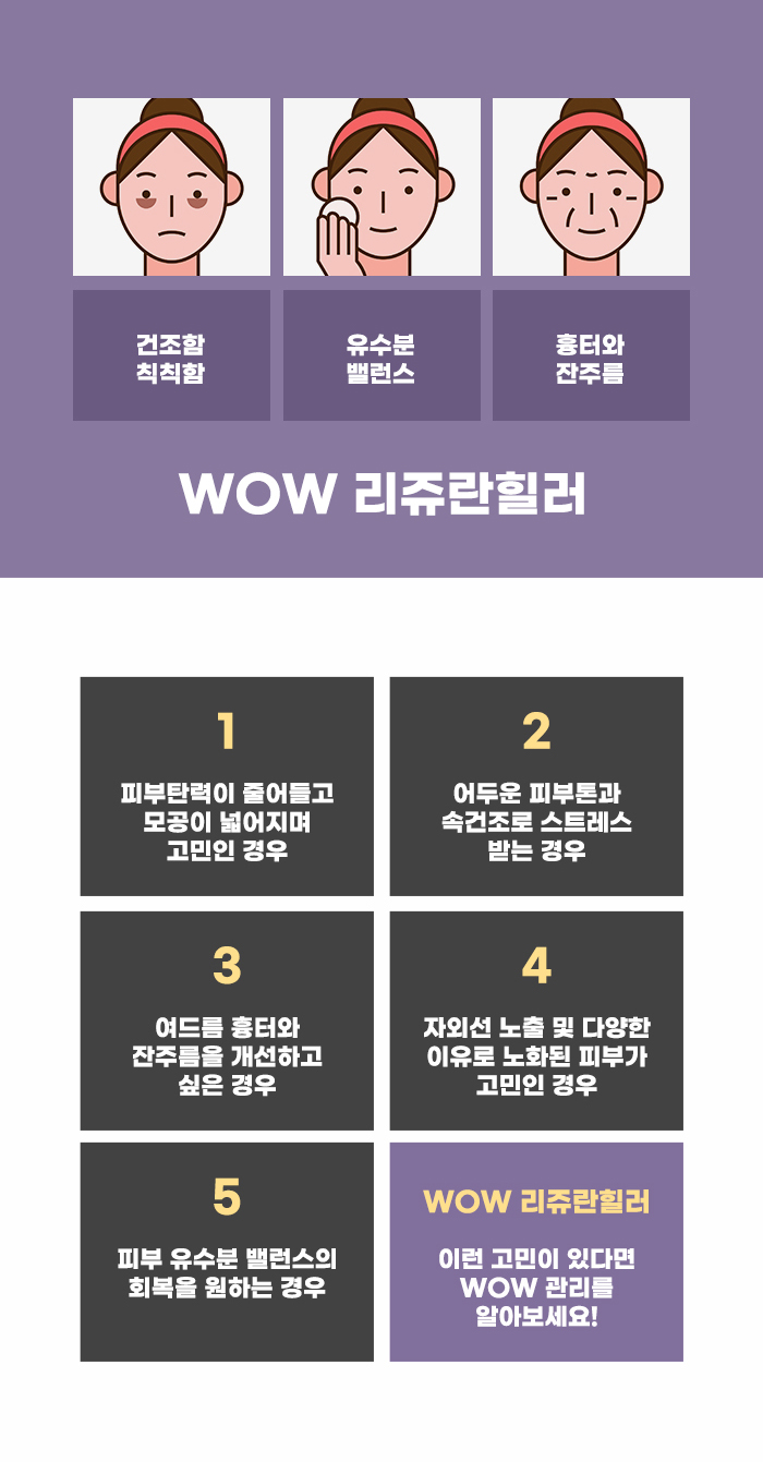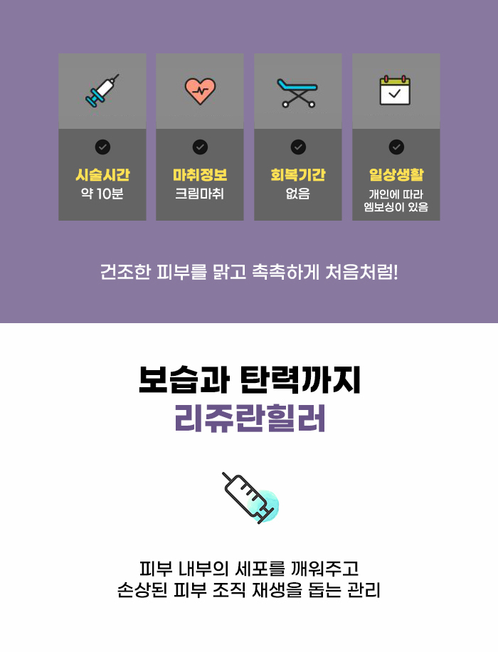 피부 노화는 모든 사람에게 찾아오는 것인데요, 하지만 자외선 외부 자극 등으로 인해 더욱 피부 노화가 잘 드러나 보이는 분도 있습니다. 리쥬란힐러는 자외선 노출이나 다양한 이유로 인해 노화된 피부가 고민인 분, 어두워지고 속 건조가 생긴 피부로 고민하는 분도 찾고 있는 것 같습니다.